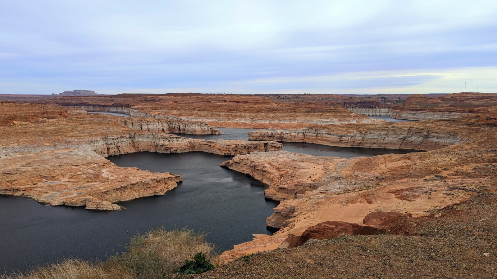 We started out at the Carl Hayden Visitor Center right next to Glen Canyon Dam.  This visitor center was quite large and contained a ton of information about the dam, Lake Powell, and the surrounding area.  We spent a lot of time browsing the exhibits and watching a film about building the dam, then we went out to their observation areas and took in the views of the dam and walked across the adjacent bridge.  From there we drove to the Wahweap area to see Lake Powell a little closer up.  We’re sure you’ve all heard about the water shortage in the west, and it was very obvious when looking at Lake Powell.  The water level is the lowest it has ever been since it filled, and it was obvious everywhere we looked.  From boat ramps that no longer make it to lake level, to the massive white cliffs that show where the water level once was, this is no longer the great reservoir it once was.  We read an article today that said eventually (and inevitably), the water level will get so low that the dam will no longer be able to generate power.  The other thing that we noted while in the Wahweap area was the lack of people.  Obviously, with this being a lake area, summer is their season, but there were a surprisingly small number of cars in the parking lot of the lodge, and the Wahweap Campground had no more than 10 campers there.  And to think that we were worried about not being able to find a spot to stay!  We found the people later in our visit to Page, but they obviously weren’t staying in the Wahweap area!