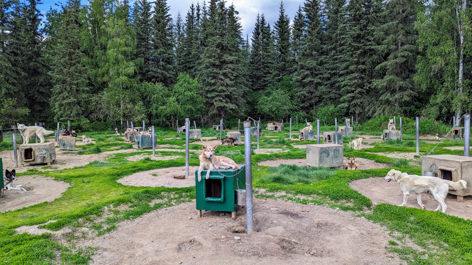 On Tuesday, we were considering a dog kennel tour.  Yes, this resort has a dog kennel (84 dogs strong!) that they use for dog sledding in the winter.  In the summer, they do dog cart rides ($65/person) and dog kennel tours ($25/person), but you can also just walk over to the dog kennel during the day and pet some of the dogs as well as see some dog sleds and read some informational panels in the visitor center.  We walked over before purchasing a tour to see what it was like and determine if we thought the tour was worth the cost.  When we walked over, the super friendly kennel staff told us we were welcome to pet the dogs along the fence of the kennel yards, but not to go inside the fences, and that we were welcome to explore the visitor center as well.  We chatted with her for a few minutes and asked what the tour would entail and she said that with a tour you are allowed to enter one of the kennel yards and interact a little more with the dogs, and that there would be a talk to go over some of the information displayed in the visitor center.  Unfortunately, there is no dog sled/cart demonstration during a summer tour.  We spent over an hour petting the beautiful dogs along the fences and exploring inside, and decided that was good enough for us.  We had to get out of there before Heather was convinced to adopt a pair of brothers that she had fallen in love with!  They do adopt the dogs out when they are ready to retire, so if you are looking for some new friends, go check out Jabba and Solo.  They are the sweetest!  But make sure to take both of them; they are pretty bonded!