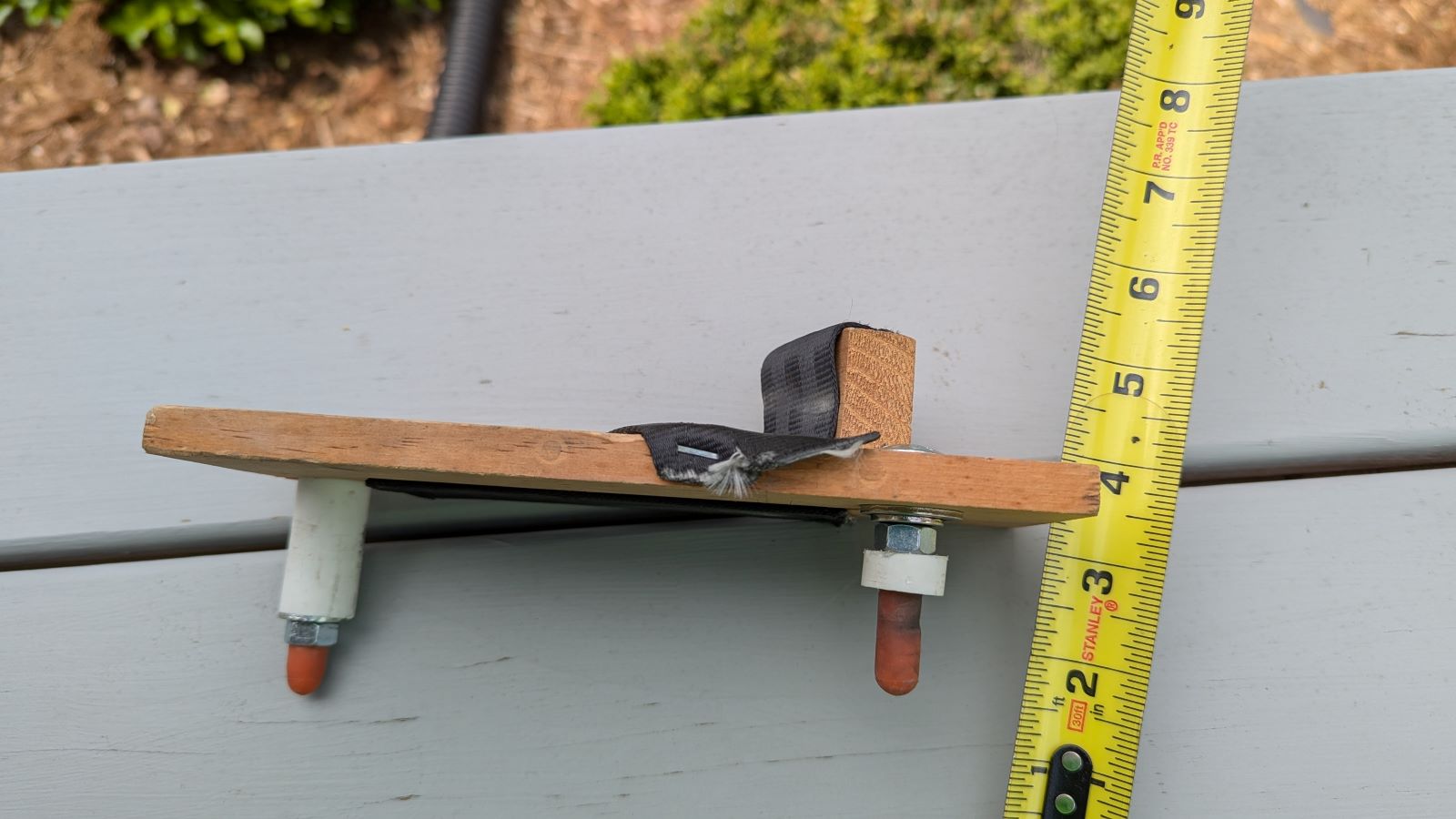 The small bracket has wood and seatbelt material on one side and two sections of PVC pipe on the other side acting as a spacer to maintain distance between the folded ends of the bike. The PVC pipe spacers have rubber tips and one of the rubber tips goes into a hole on the opposite side of the frame as the large bracket, and the other PVC spacer just rests up against the frame. When the bike is folded, the seat belt material comes into contact with the frame on the other side to hold the two sides apart.