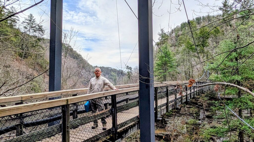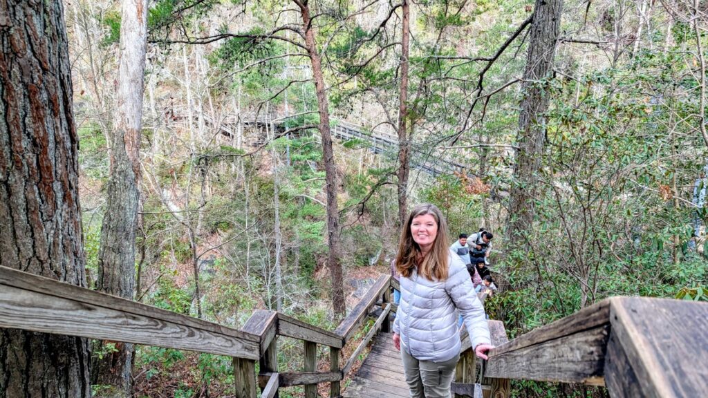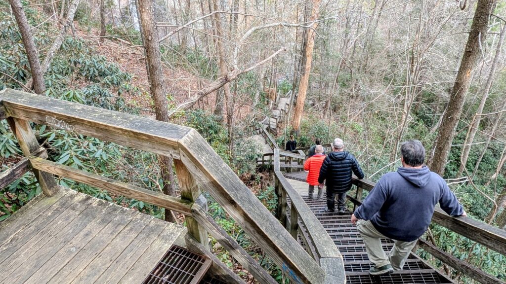 Instead, we did the Hurricane Falls Loop Trail. This route utilizes parts of the North Rim Trail and the South Rim Trail, along with a massive staircase that takes you down to a suspension bridge, and another staircase that takes you to the base of Hurricane Falls at river level, if you choose to go that far. (We did!) Note that this means there are a LOT of stairs to climb down, and then, of course, back up – over 500 stairs each way. It also pretty much takes you to the gorge floor without having to have a permit. Without the permit you are not allowed to leave the steps and boardwalk area, but you can still get down to experience the river and the base of Hurricane Falls. It was a great hike with some great views, and the suspension bridge was a nice experience, too! While we don’t recommend this trail to anyone with health or mobility issues, our group agreed that it wasn’t as difficult as we expected. If you are in reasonably good health you should be fine as long as you take your time.